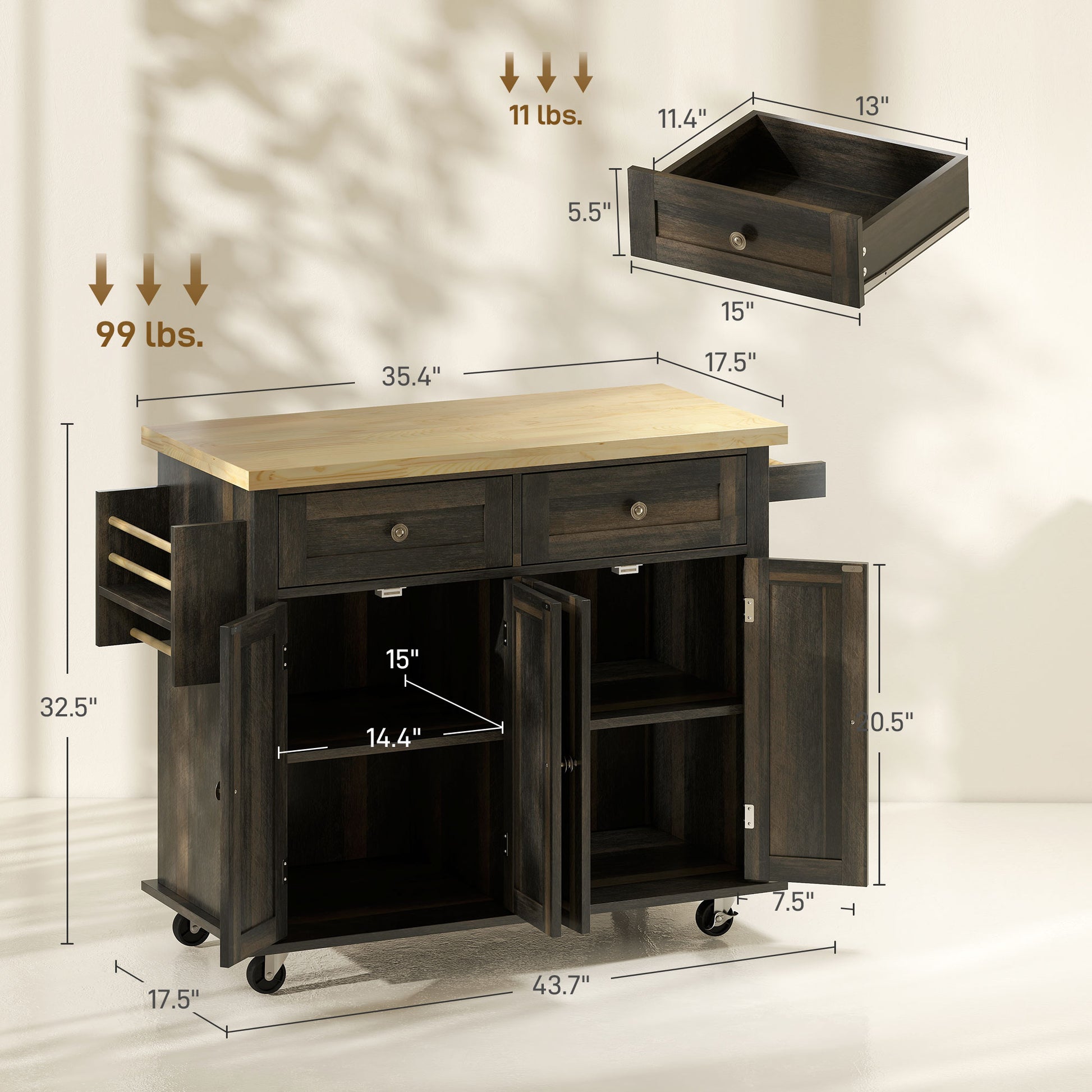 Are you looking to maximize your kitchen space? This rolling island features a simple modern design and can fit into various styles of decorations. It comes with two easy-glide drawers, two concealed cabinets, a towel bar, and a spice rack. This portable island for the kitchen has a compact design and great storage capabilities. Upgrade your kitchen today with our HOMCOM kitchen island. Features: - Simple modern design, fit into kitchen and dining room - 2 easy-glide drawers, two concealed cabinets, a towel bar, and a spice rack provide ample storage - 2 cabinets have an adjustable shelf for flexible storage solution - Made of solid P2 MDF and P2 particleboard for reliable daily use and easy cleaning - Varnished rubberwood tabletop is water-resistant and easy to clean - 4 smooth-rolling kitchen cart casters with two locking brakes provide mobility and stability - Assembly required Specification: - Color: White - Material: P2 MDF, P2 Particleboard, Rubberwood - Overall Dimensions: 43.75" W x 17.5" D x 32.5" H - Drawer Inner Size: 13" W x 11.5" D x 3.25" H - Cabinet Inner Size: 15" W x 14.25" D x 20.5" H - Shelf Size: 14.25" W x 15" D - Net Weight: 70 lbs. - Weight Capacity: 100 lbs. (Overall), 17.6 lbs. (Shelf), 11 lbs. (Drawer) - Item Label: 801-161WT Package Includes: 1 x Kitchen Island 1 x Manual Are you looking to maximize your kitchen space? Features: - Simple modern design, fit into kitchen and dining room - 2 easy-glide drawers, two concealed cabinets, a towel bar, and a spice rack provide ample storage - 2 cabinets have an adjustable shelf for flexible storage solution - Made of solid P2 MDF and P2 particleboard for reliable daily use and easy cleaning - Varnished rubberwood tabletop is water-resistant and easy to clean - 4 smooth-rolling kitchen cart casters with two locking brakes provide mobility and stability - Assembly required Specification: - Color: Black - Material: P2 MDF, P2 Particleboard, Rubberwood - Overall Dimensions: 43.75" W x 17.5" D x 32.5" H - Drawer Inner Size: 13" W x 11.5" D x 3.25" H - Cabinet Inner Size: 15" W x 14.25" D x 20.5" H - Shelf Size: 14.25" W x 15" D - Net Weight: 70 lbs. (Drawer) - Item Label: 801-161BK Package Includes: 1 x Kitchen Island 1 x Manual Are you looking to maximize your kitchen space? Features: - Simple modern design, fit into kitchen and dining room - 2 easy-glide drawers, two concealed cabinets, a towel bar, and a spice rack provide ample storage - 2 cabinets have an adjustable shelf for flexible storage solution - Made of solid P2 MDF and P2 particleboard for reliable daily use and easy cleaning - Varnished rubberwood tabletop is water-resistant and easy to clean - 4 smooth-rolling kitchen cart casters with two locking brakes provide mobility and stability - Assembly required Specification: - Color: Grey - Material: P2 MDF, P2 Particleboard, Rubberwood - Overall Dimensions: 43.75" W x 17.5" D x 32.5" H - Drawer Inner Size: 13" W x 11.5" D x 3.25" H - Cabinet Inner Size: 15" W x 14.25" D x 20.5" H - Shelf Size: 14.25" W x 15" D - Net Weight: 70 lbs. (Drawer) - Item Label: 801-161GY Package Includes: 1 x Kitchen Island 1 x Manual Are you looking to maximize your kitchen space? Features: - Simple modern design, fit into kitchen and dining room - 2 easy-glide drawers, two concealed cabinets, a towel bar, and a spice rack provide ample storage - 2 cabinets have an adjustable shelf for flexible storage solution - Made of solid P2 MDF and P2 particleboard for reliable daily use and easy cleaning - Varnished rubberwood tabletop is water-resistant and easy to clean - 4 smooth-rolling kitchen cart casters with two locking brakes provide mobility and stability - Assembly required Specification: - Color: Brown Oak - Material: P2 MDF, P2 Particleboard, Rubberwood - Overall Dimensions: 43.75" W x 17.5" D x 32.5" H - Drawer Inner Size: 13" W x 11.5" D x 3.25" H - Cabinet Inner Size: 15" W x 14.25" D x 20.5" H - Shelf Size: 14.25" W x 15" D - Net Weight: 70 lbs. (Drawer) - Item Label: 801-161AK Package Includes: 1 x Kitchen Island 1 x Manual Are you looking to maximize your kitchen space? Features: - Simple modern design, fit into kitchen and dining room - 2 easy-glide drawers, two concealed cabinets, a towel bar, and a spice rack provide ample storage - 2 cabinets have an adjustable shelf for flexible storage solution - Made of solid P2 MDF and P2 particleboard for reliable daily use and easy cleaning - Varnished rubberwood tabletop is water-resistant and easy to clean - 4 smooth-rolling kitchen cart casters with two locking brakes provide mobility and stability - Assembly required Specification: - Color: Distressed Black - Material: P2 MDF, P2 Particleboard, Rubberwood - Overall Dimensions: 43.75" W x 17.5" D x 32.5" H - Drawer Inner Size: 13" W x 11.5" D x 3.25" H - Cabinet Inner Size: 15" W x 14.25" D x 20.5" H - Shelf Size: 14.25" W x 15" D - Net Weight: 70 lbs. (Drawer) - Item Label: 801-161V81BK Package Includes: 1 x Kitchen Island 1 x Manual Are you looking to maximize your kitchen space? Features: - Simple modern design, fit into kitchen and dining room - 2 easy-glide drawers, two concealed cabinets, a towel bar, and a spice rack provide ample storage - 2 cabinets have an adjustable shelf for flexible storage solution - Made of solid P2 MDF and P2 particleboard for reliable daily use and easy cleaning - Varnished rubberwood tabletop is water-resistant and easy to clean - 4 smooth-rolling kitchen cart casters with two locking brakes provide mobility and stability - Assembly required Specification: - Color: Distressed White - Material: P2 MDF, P2 Particleboard, Rubberwood - Overall Dimensions: 43.75" W x 17.5" D x 32.5" H - Drawer Inner Size: 13" W x 11.5" D x 3.25" H - Cabinet Inner Size: 15" W x 14.25" D x 20.5" H - Shelf Size: 14.25" W x 15" D - Net Weight: 70 lbs. (Drawer) - Item Label: 801-161V81WT Package Includes: 1 x Kitchen Island 1 x Manual.